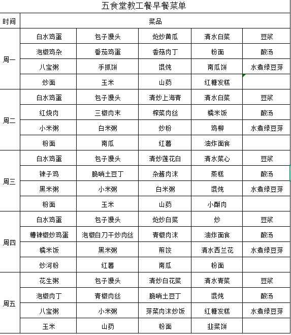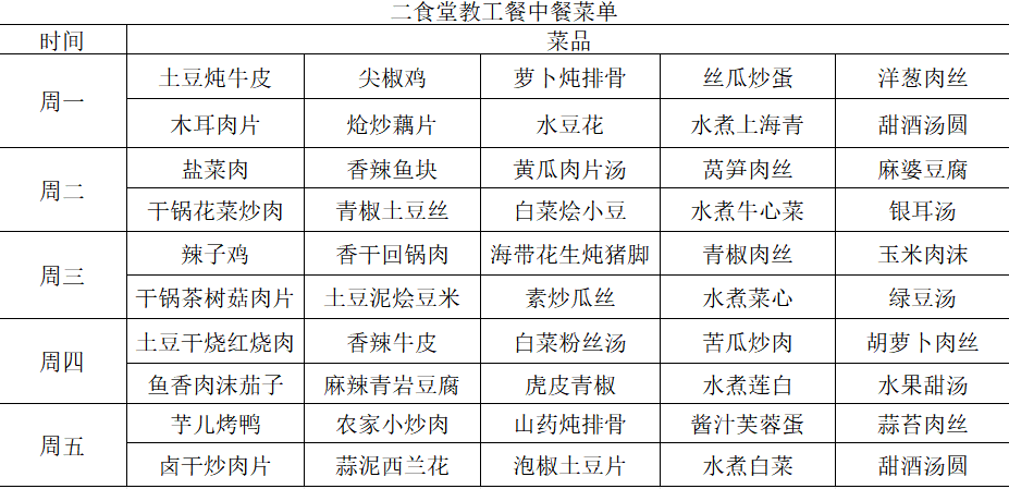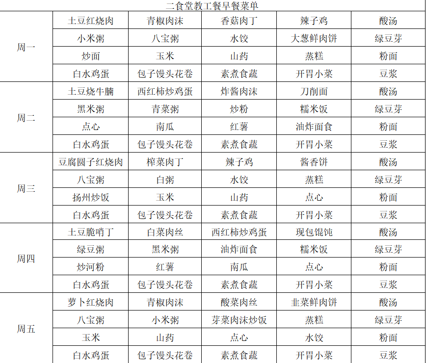 一日辛劳,终食人间烟火,您的三餐,我们温柔守候。熟悉的暖心味道藏在每一餐里,新鲜的美味惊喜也正待您探寻!下周的校园美食之旅即将开启,为了让大家提前规划用餐安排,享受到更便捷、舒心的就餐体验,我校二、五食堂教工餐厅已精心搭配好下周的早餐与中餐菜单。下方为详细的菜单表格,愿老师们每一顿都吃得满足,日常时光里处处有惬意!