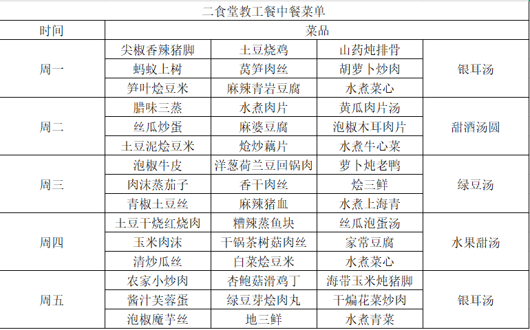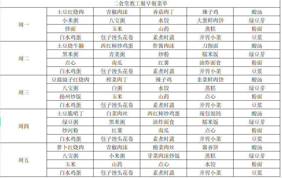 又新的一周即将到来,为方便大家提前规划用餐,我校二、五食堂教工餐厅精心准备了下周早餐及午餐菜单。详细菜品已整理公布,欢迎各位老师阅览参考,选择心仪的餐食。