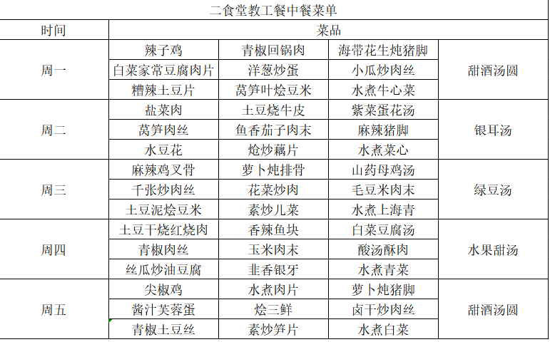 食堂的烟火气始终为您守候,熟悉的暖心味道藏在每一餐里,新鲜的美味惊喜也正待您探寻!下周的校园美食之旅即将开启,为了让大家提前规划用餐安排,享受到更便捷、舒心的就餐体验,我校二、五食堂教工餐厅已精心搭配好下周的早餐与中餐菜单。下方为详细的菜单表格,愿老师们每一顿都吃得满足,日常时光里处处有惬意!