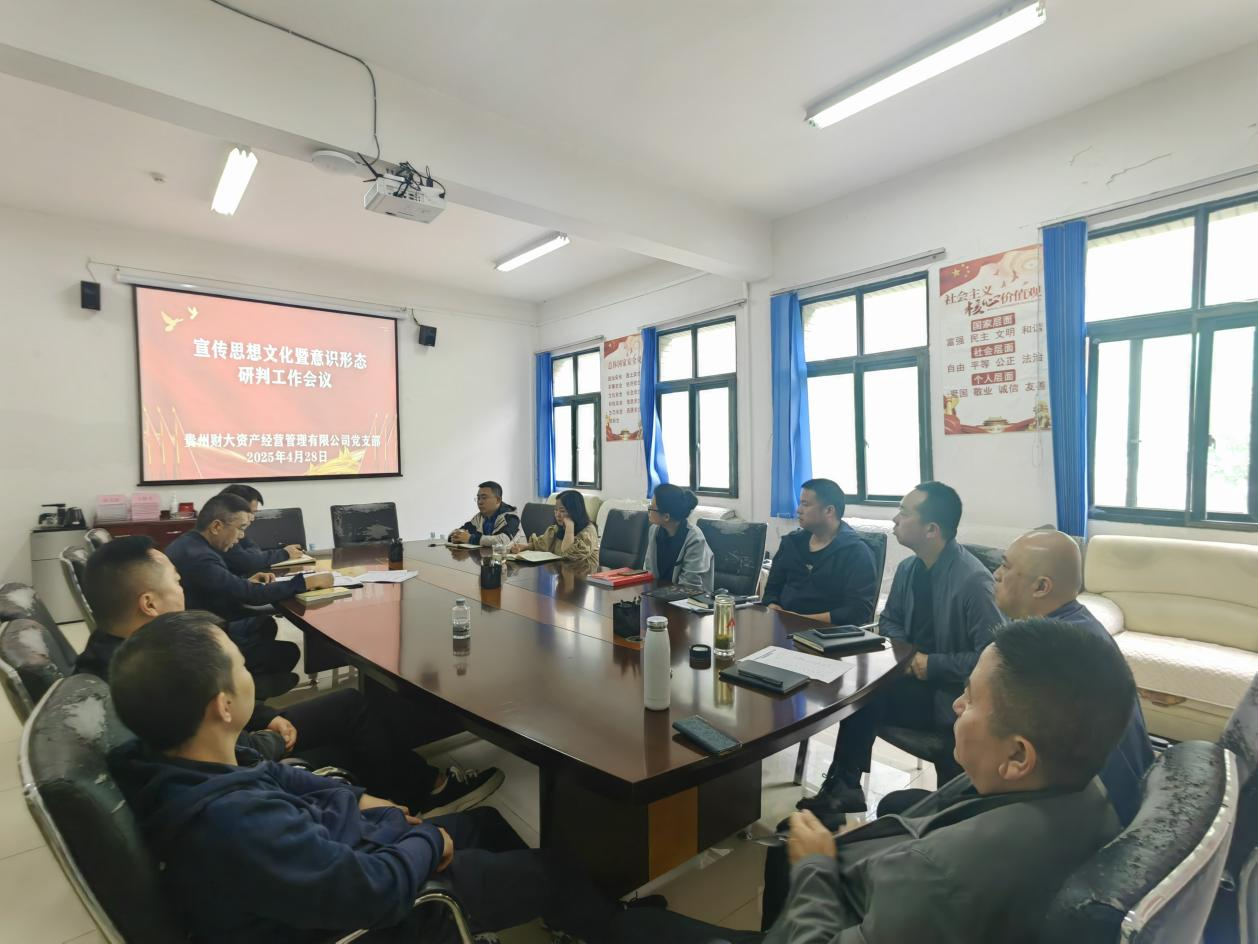 4月28日,贵州财大资产经营管理有限公司党支部在敦行楼一楼会议室召开2025年上半年思想宣传暨意识形态工作研判会议。会议由党支部书记罗玉江主持,全体党员、资产公司各中心经理参加。