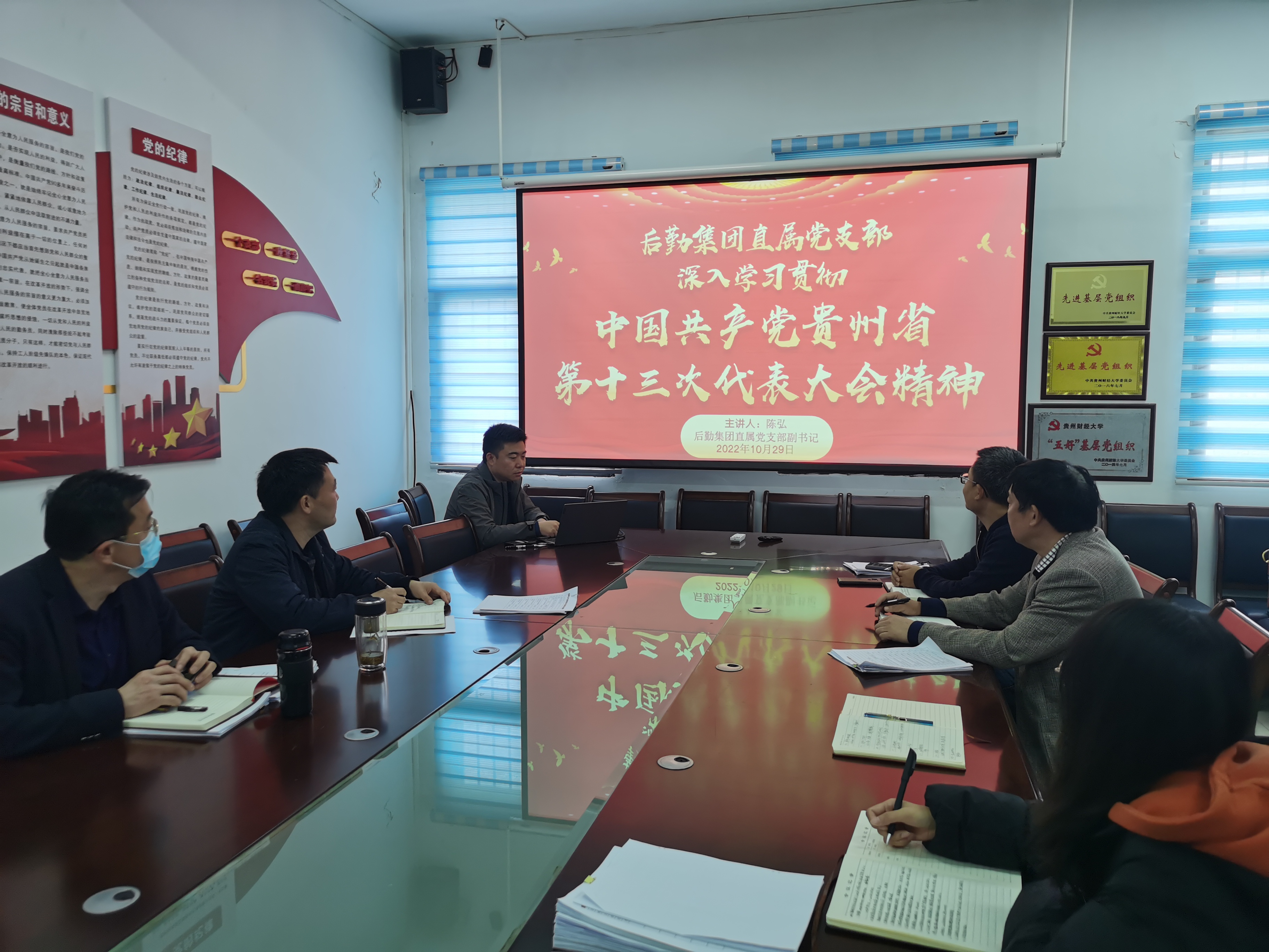 10月29日,后勤集团直属党支部传达学习中国共产党贵州省第十三次代表大会精神,会议由党支部副书记、总经理陈弘主持,党支部支委、党员及资产公司干部职工参加会议。