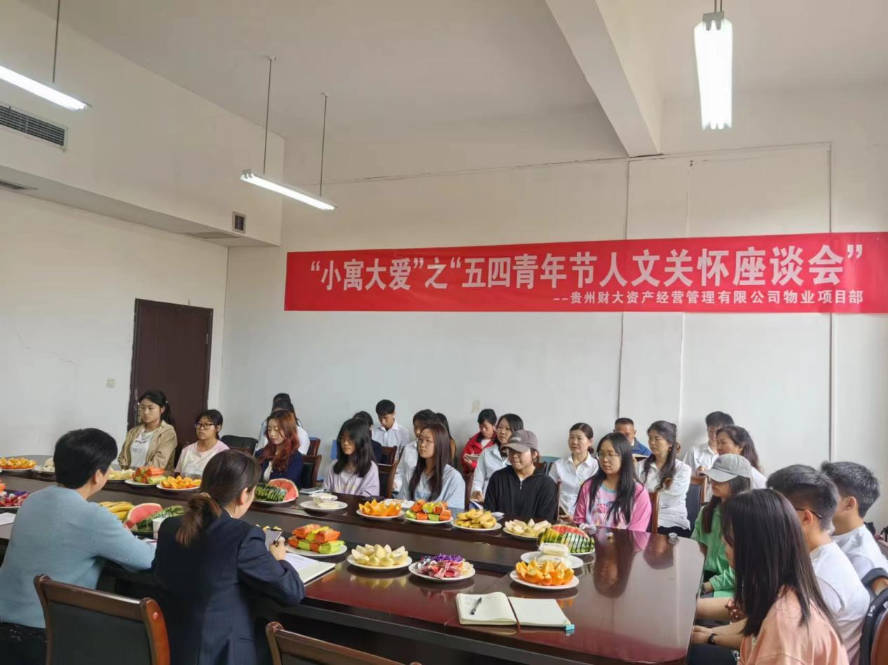 为把“人文贵财”建设工作落实落细,贵州财大资产经营管理有限公司物业项目部在五四青年节到来之际,于2024年4月30日下午组织部分员工代表与学生代表在勤学楼进行座谈,开展此项活动,拓宽了后勤保障服务人员与莘莘学子的沟通渠道,加强了相互之间的交流、沟通和理解。贵州财大资产经营管理有限公司副总经理吴健参加此次座谈会。
