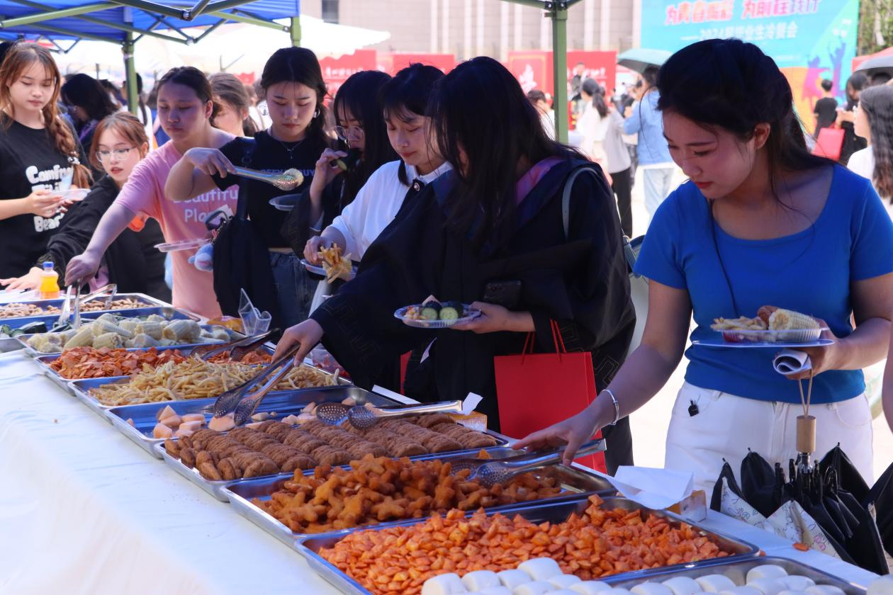 活动现场,学校领导、老师及毕业学生在学生活动中心广场一起用餐、亲切交谈并畅聊未来。