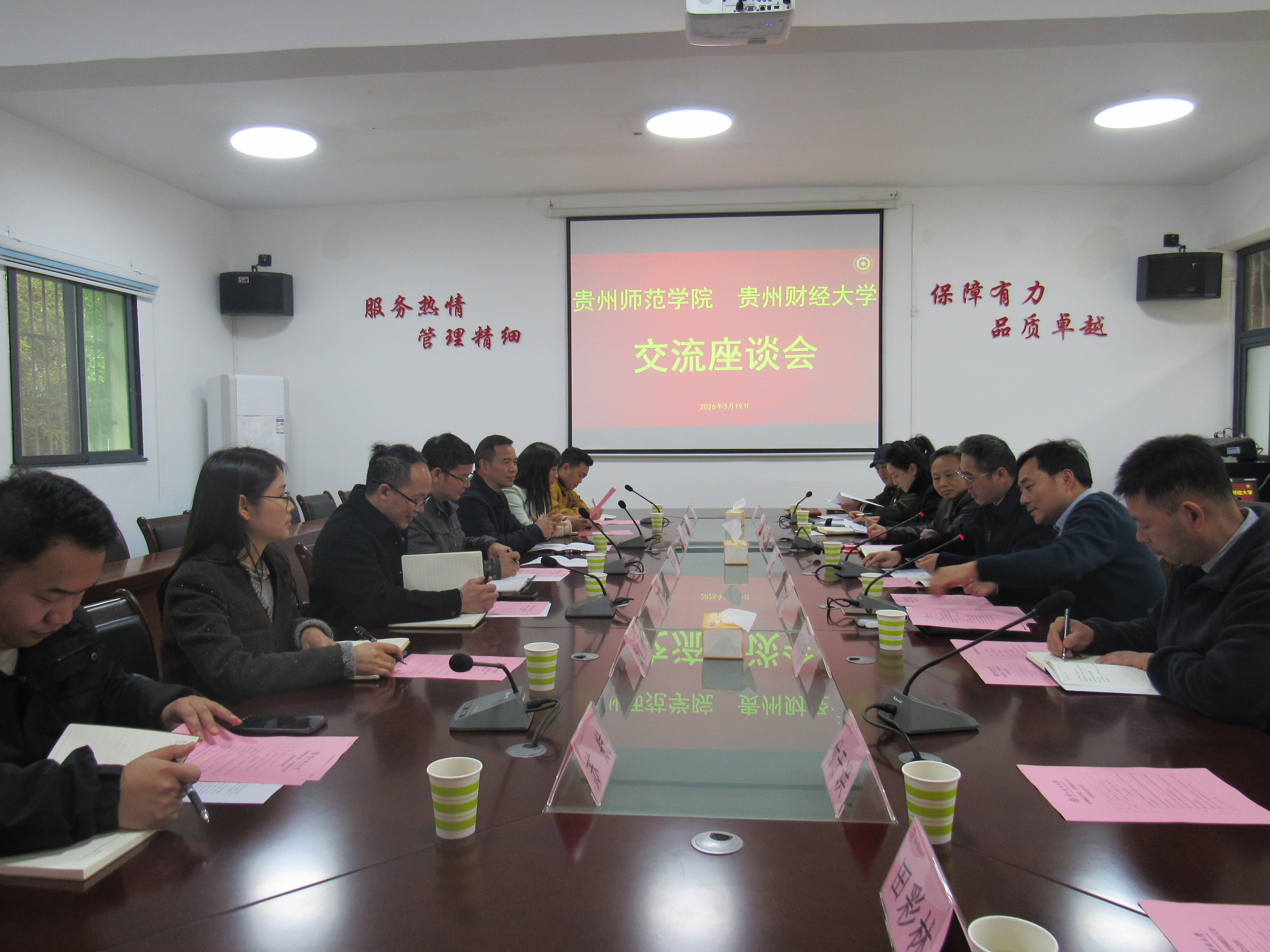 3月19日下午,贵州师范学院副校长陈真波、后勤处处长干正洋一行到我校交流座谈学习。贵州财经大学党委常委、副校长杜剑、后勤处处长胡张林、资产公司总经理朱泉明及相关工作人员陪同。