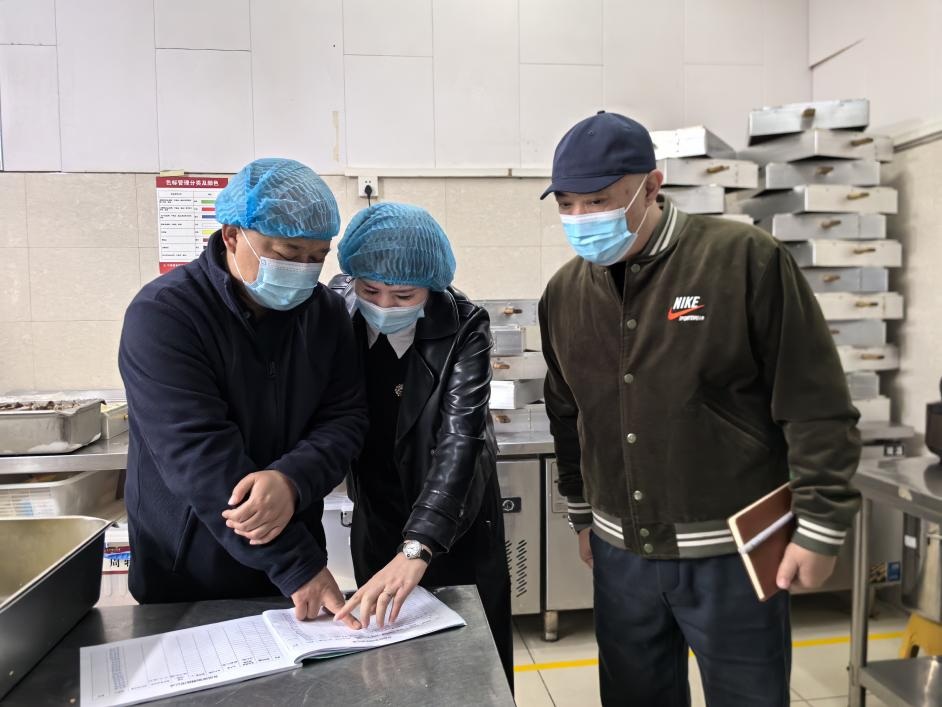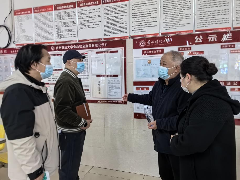 3月20日,贵安新区市场监管局党武分局副局长刘军一行到我校食堂开展食品安全专项检查,贵州财大资产经营管理有限公司餐饮项目部经理宋佳及食堂相关工作人员陪同检查。