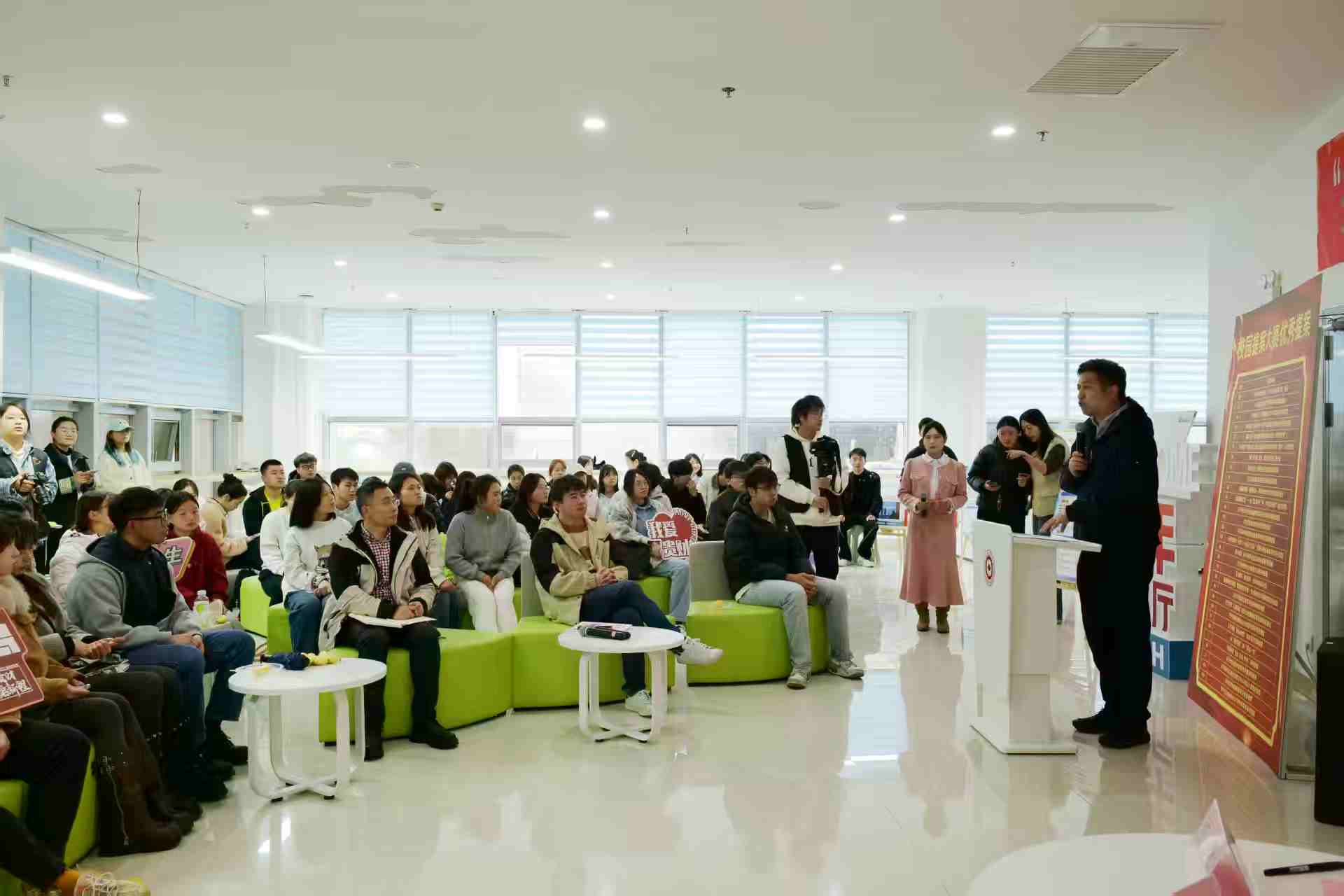 活动围绕校园生活保障、商业服务等学子关心的核心话题展开深度互动。同学们纷纷就食堂菜品多元化升级、物业服务精细化程度提升及校园快递服务优化等方面提出意见和建议,学校后勤处领导及公司工作人员现场逐一进行回复解答。公司总经理朱泉明在现场向同学们介绍了资产公司的业务范围及服务理念,并表示:“贵州财大资产经营管理有限公司作为学校直属的校办企业,主要承担校园物业、食堂运营服务及商业资源管理等工作,始终坚持‘以师生为中心’的服务宗旨,致力于为师生排忧解难、为学校发展贡献力量。希望今后能搭建更多常态化交流平台,与同学们携手共进,共同建设温馨和谐的家园。对于大家今天提出的宝贵意见和建议,我们将第一时间梳理研判,尽快推动各项优化措施落地见效。”