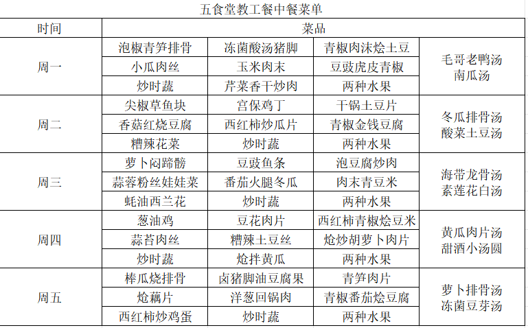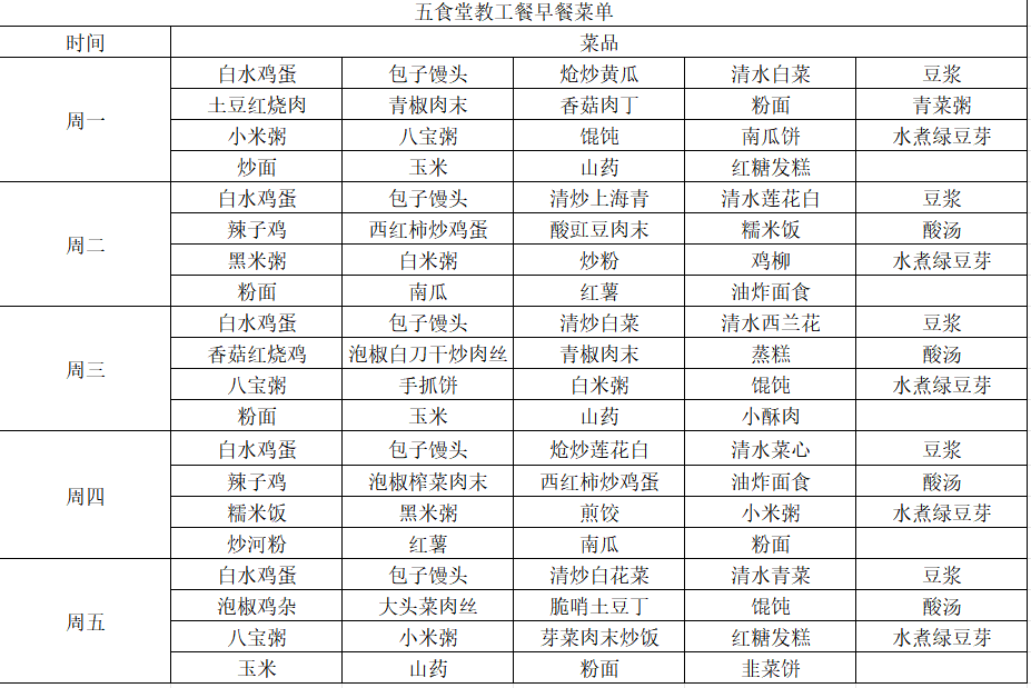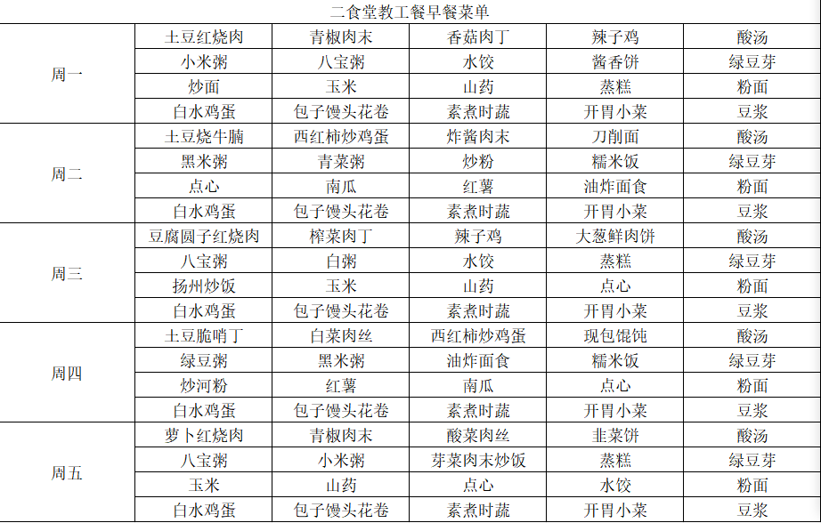 食堂的烟火气始终为您守候,熟悉的暖心味道藏在每一餐里,新鲜的美味惊喜也正待您探寻!下周的校园美食之旅即将开启,为了让大家提前规划用餐安排,享受到更便捷、舒心的就餐体验,我校二、五食堂教工餐厅已精心搭配好下周的早餐与中餐菜单。下方为详细的菜单表格,愿老师们每一顿都吃得满足,日常时光里处处有惬意!