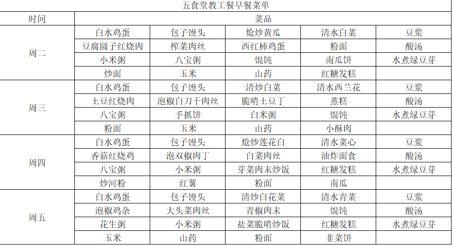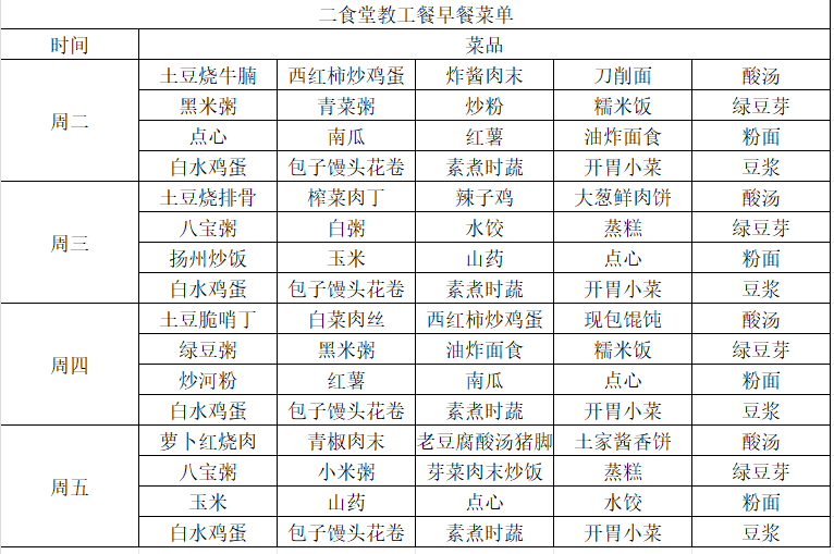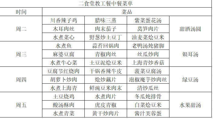 新的一周好!教工食堂已经整装待发,用满满的元气开启您活力充沛的一天。以下是详细的菜单表格,老师们可以据此提前规划自己的用餐选择哦!